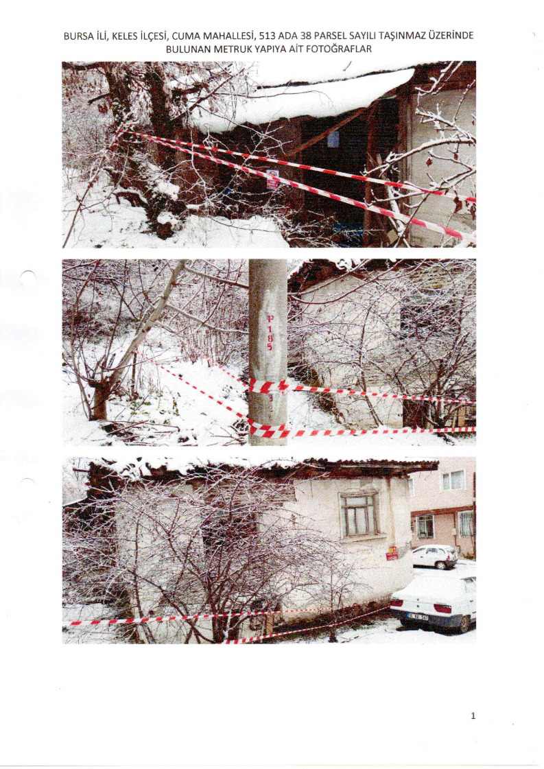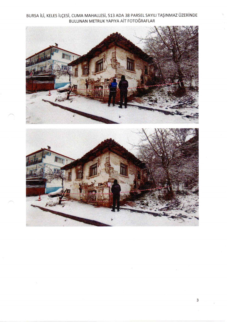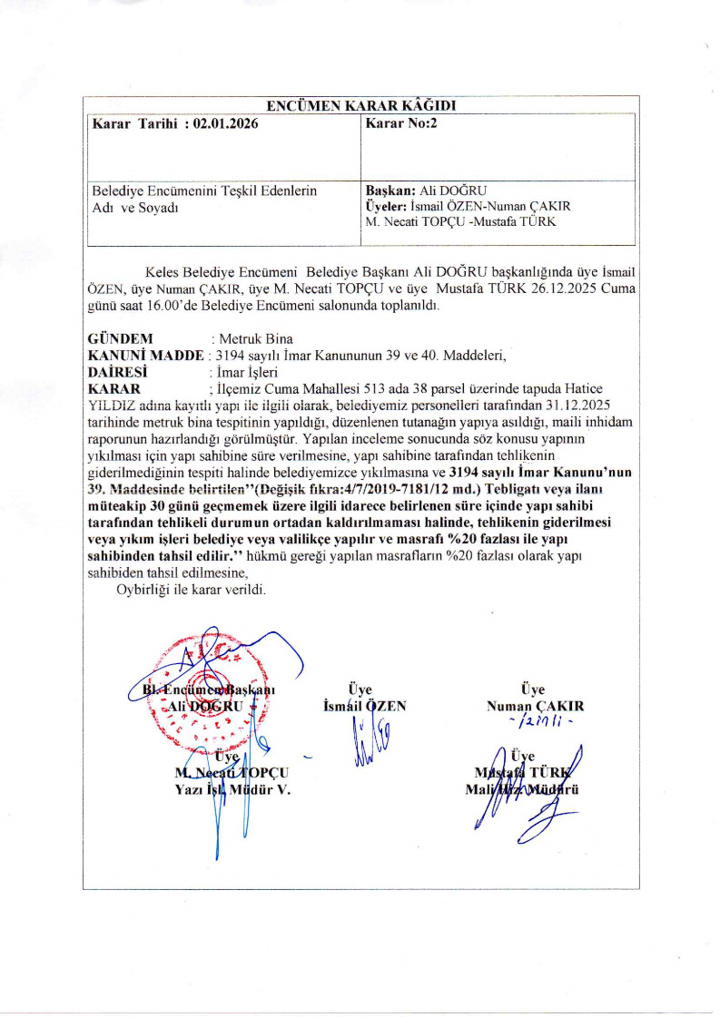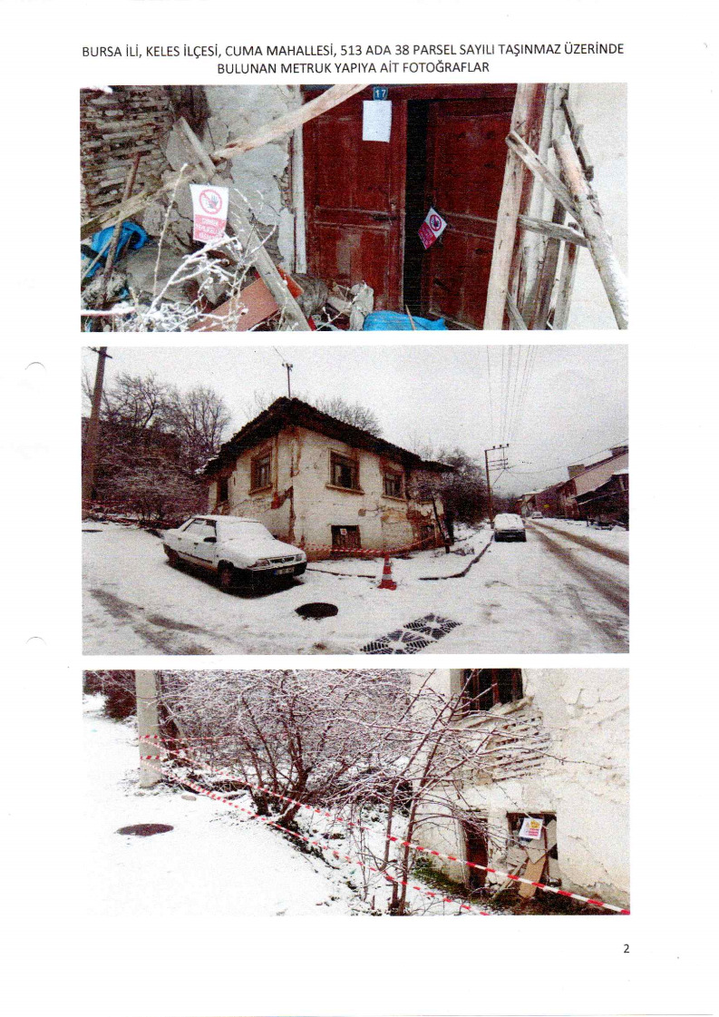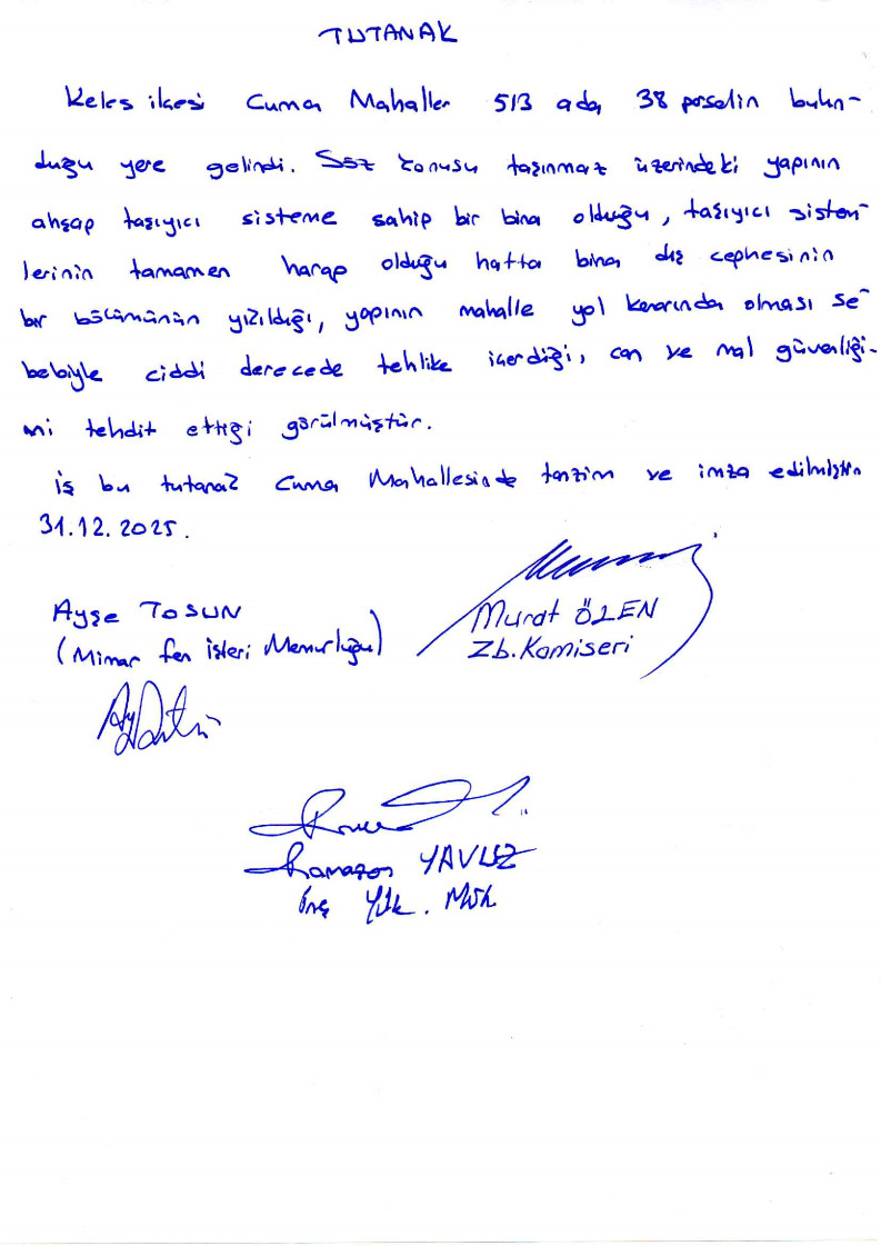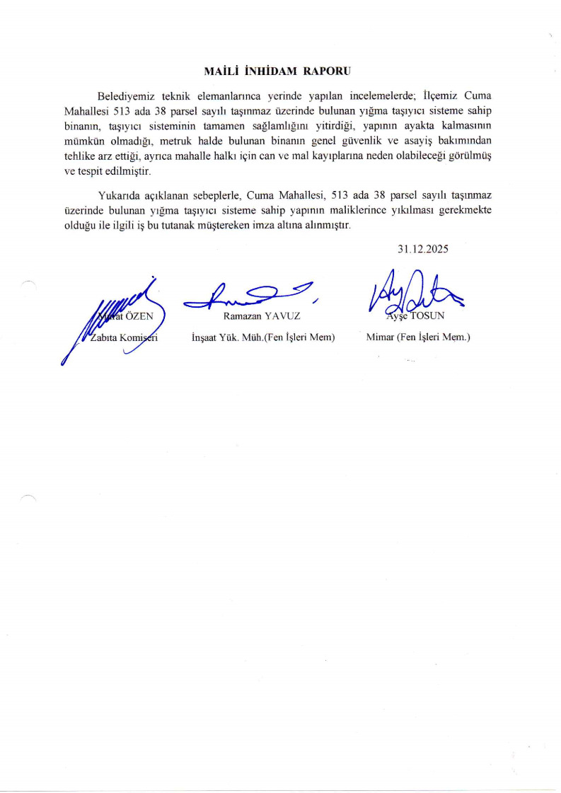 Belediyemiz teknik elemanlarınca yerinde yapılan incelemelerde; İlçemiz Cuma Mahallesi 513 ada 38 parsel sayılı taşınmaz üzerinde bulunan yığma taşıyıcı sisteme sahip binanın, taşıyıcı sisteminin tamamen sağlamlığını yitirdiği, yapının ayakta kalmasının mümkün olmadığı, metruk halde bulunan binanın genel güvenlik ve asayiş bakımından tehlike arz ettiği, ayrıca mahalle halkı için can ve mal kayıplarına neden olabileceği görülmüş ve tespit edilmiştir.