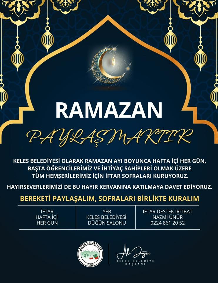 Keles Belediyesi olarak Ramazan ayı boyunca hafta içi her gün başta öğrencilerimiz ve ihtiyaç sahipleri olmak üzere tüm hemşehirlerimiz için iftar sofraları kuruyoruz.