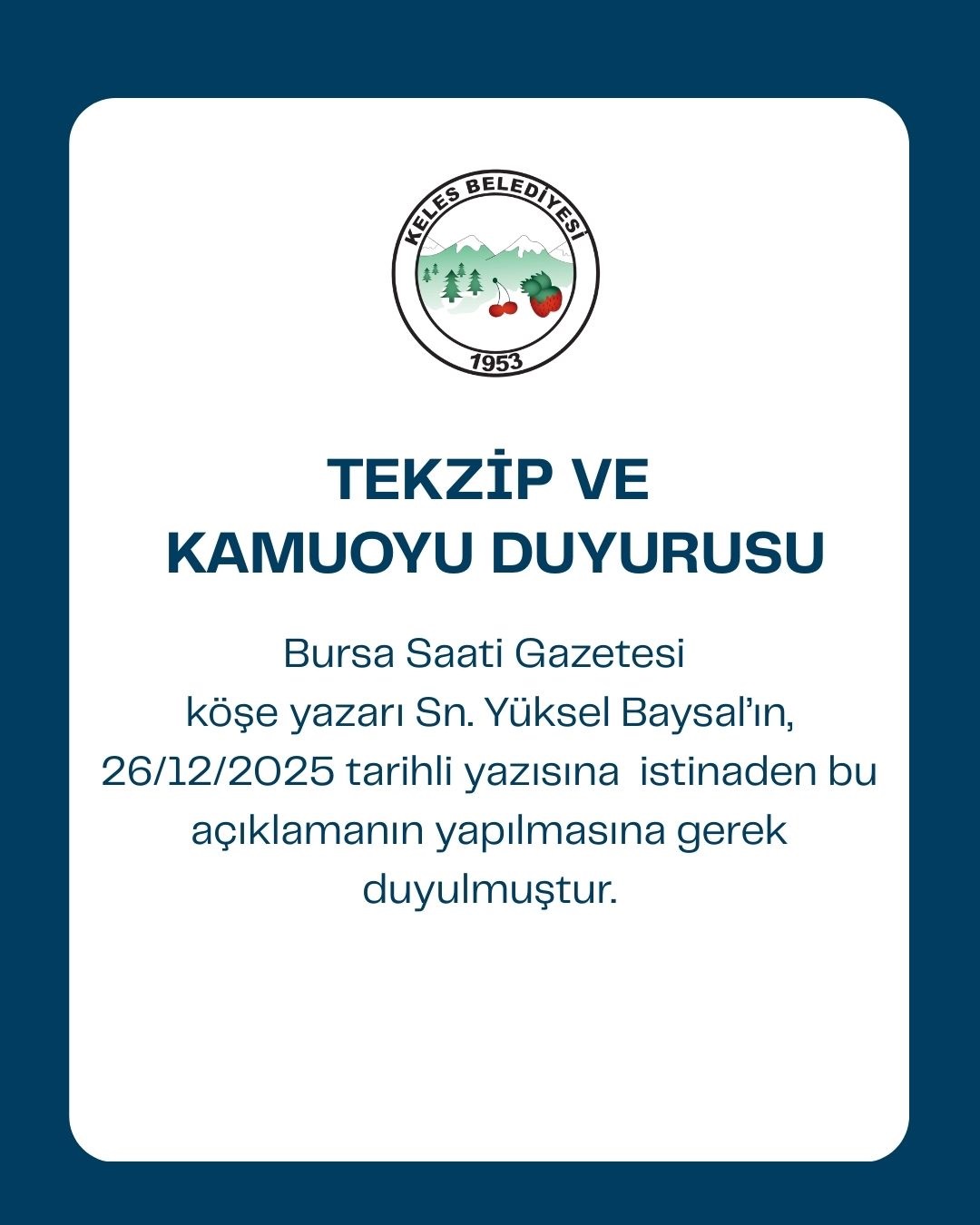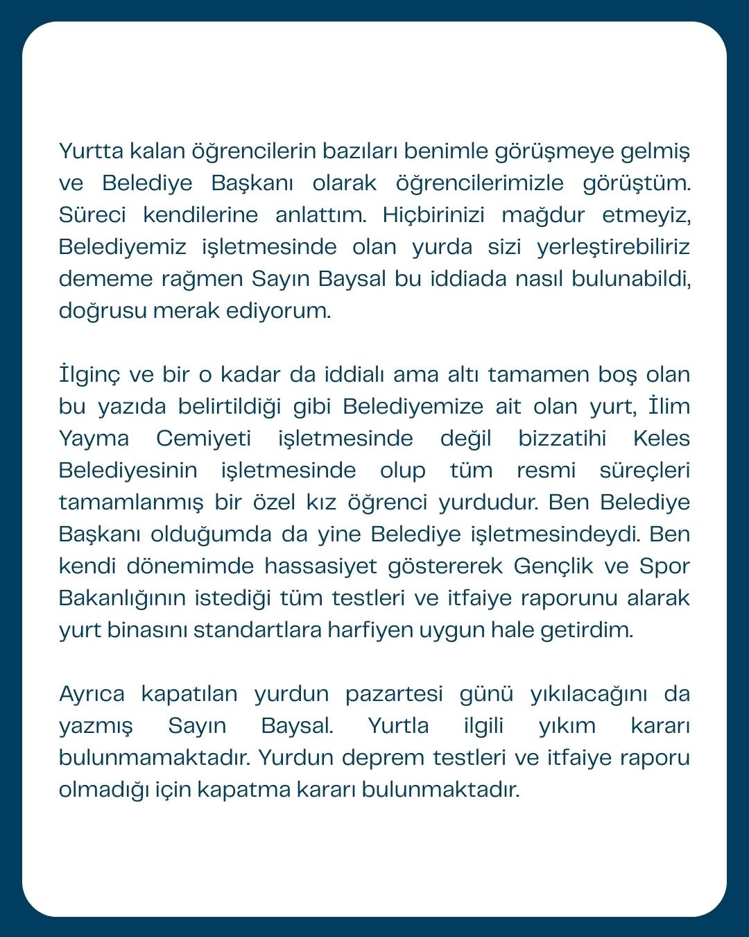 İlginç ve bir o kadar da iddialı ama altı tamamen boş olan bu yazıda belirtildiği gibi Belediyemize ait olan yurt, İlim Yayma Cemiyeti işletmesinde değil bizzatihi Keles Belediyesinin işletmesinde olup tüm resmi süreçleri tamamlanmış bir özel kız öğrenci yurdudur. Ben Belediye Başkanı olduğumda da yine Belediye işletmesindeydi.