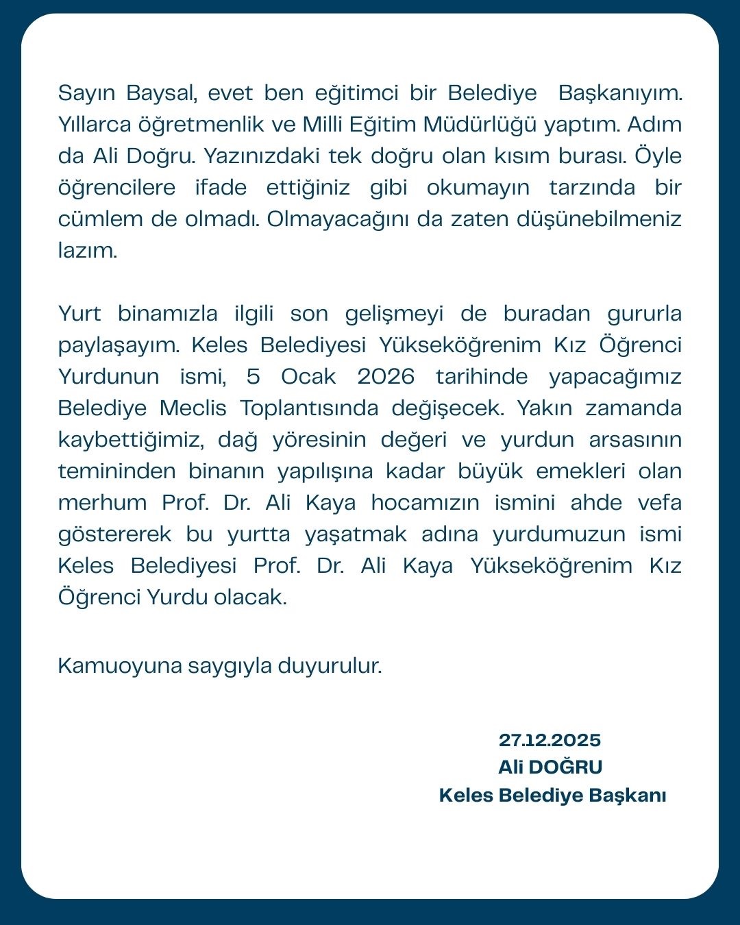 Sayın Baysal, evet ben eğitimci bir Belediye Başkanıyım. Yıllarca öğretmenlik ve Milli Eğitim Müdürlüğü yaptım. Adım da Ali Doğru. Yazınızdaki tek doğru olan kısım burası. Öyle öğrencilere ifade ettiğiniz gibi okumayın tarzında bir cümlem de olmadı. Olmayacağını da zaten düşünebilmeniz lazım.
