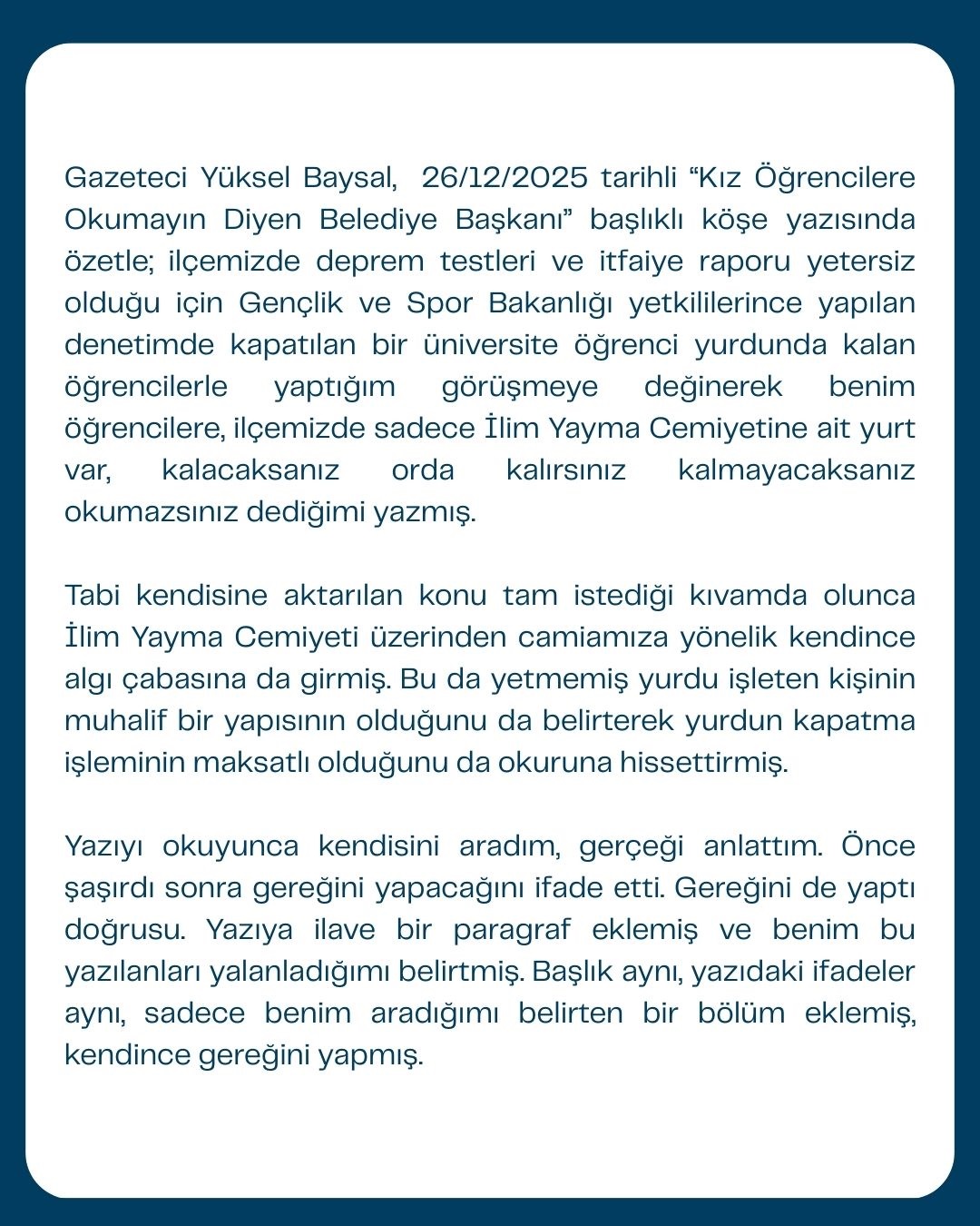 Gazeteci Yüksel Baysal, 26/12/2025 tarihli “Kız Öğrencilere Okumayın Diyen Belediye Başkanı” başlıklı köşe yazısında özetle; ilçemizde deprem testleri ve itfaiye raporu yetersiz olduğu için Gençlik ve Spor Bakanlığı yetkililerince yapılan denetimde kapatılan bir üniversite öğrenci yurdunda kalan öğrencilerle yaptığım görüşmeye değinerek benim öğrencilere, ilçemizde sadece İlim Yayma Cemiyetine ait yurt var, kalacaksanız orda kalırsınız kalmayacaksanız okumazsınız dediğimi yazmış.
