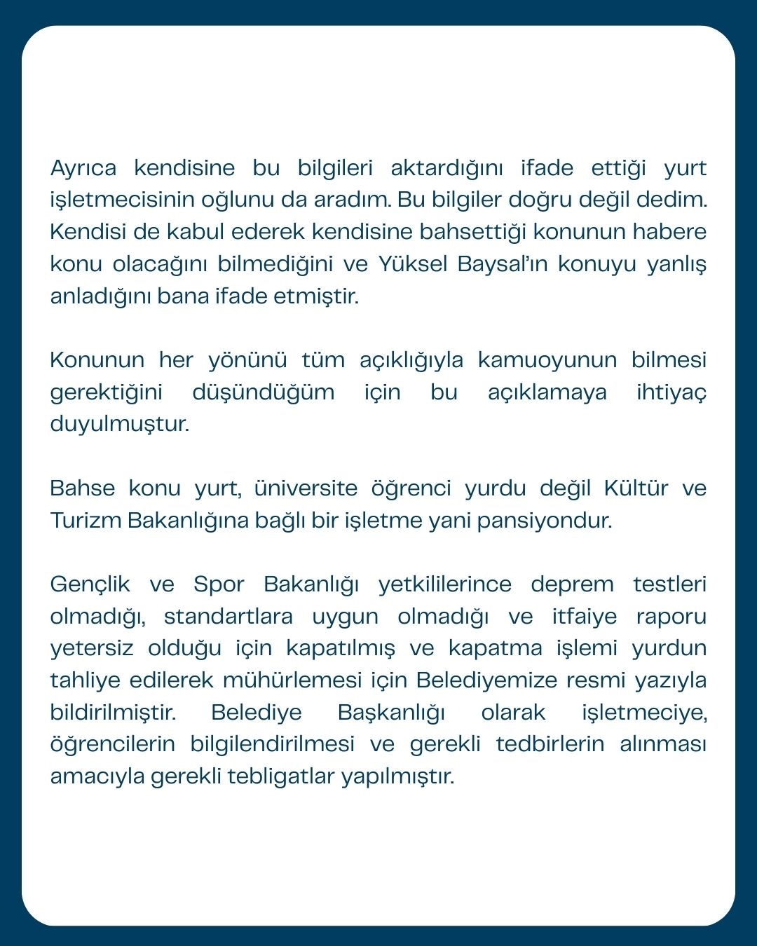 Ayrıca kendisine bu bilgileri aktardığını ifade ettiği yurt işletmecisinin oğlunu da aradım. Bu bilgiler doğru değil dedim. Kendisi de kabul ederek kendisine bahsettiği konunun habere konu olacağını bilmediğini ve Yüksel Baysal’ın konuyu yanlış anladığını bana ifade etmiştir.