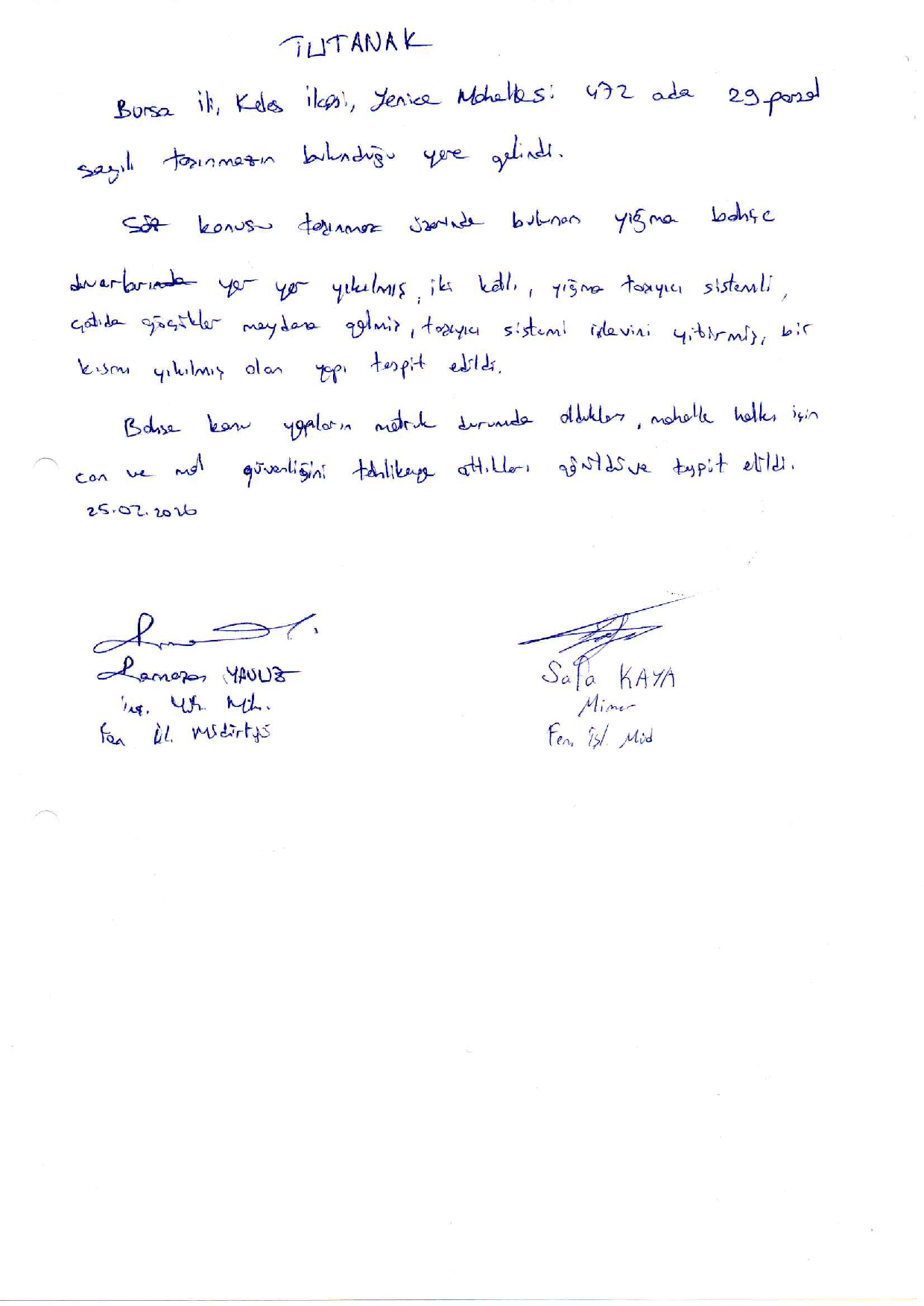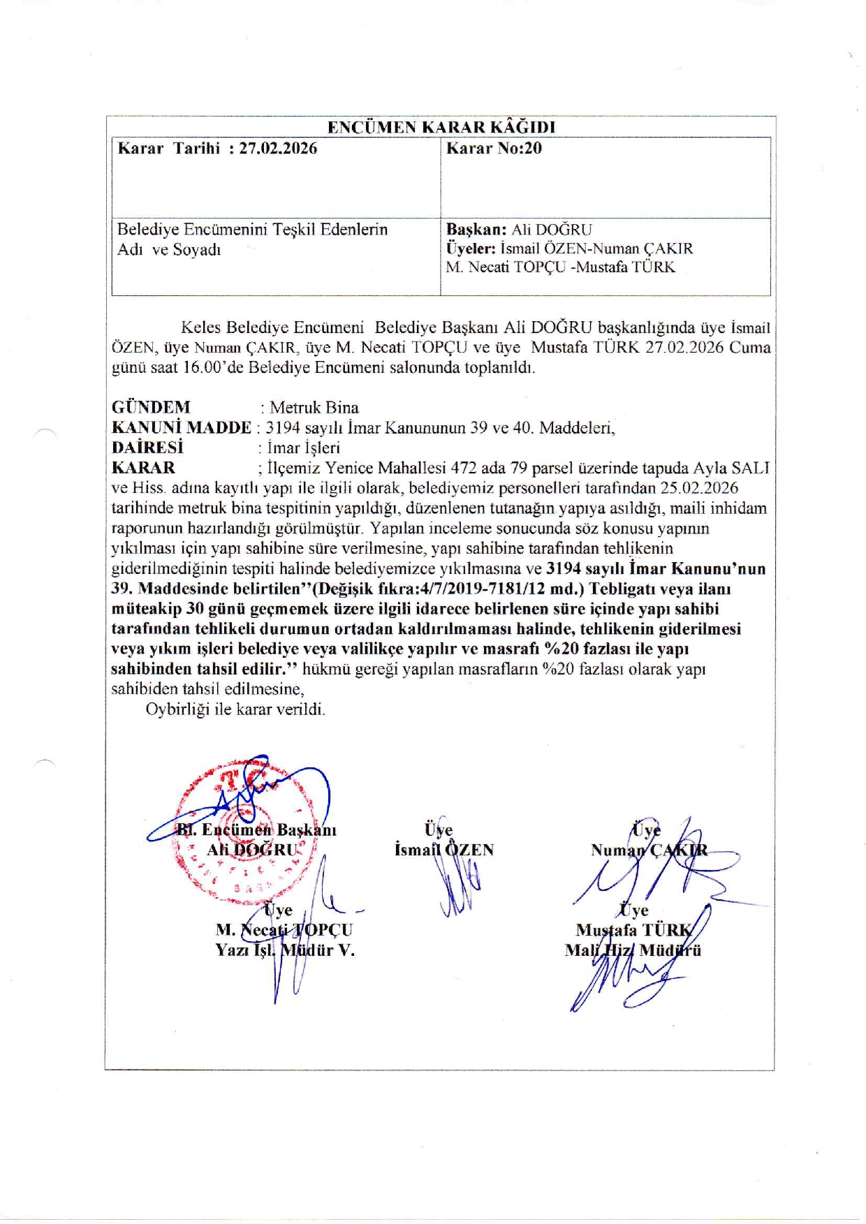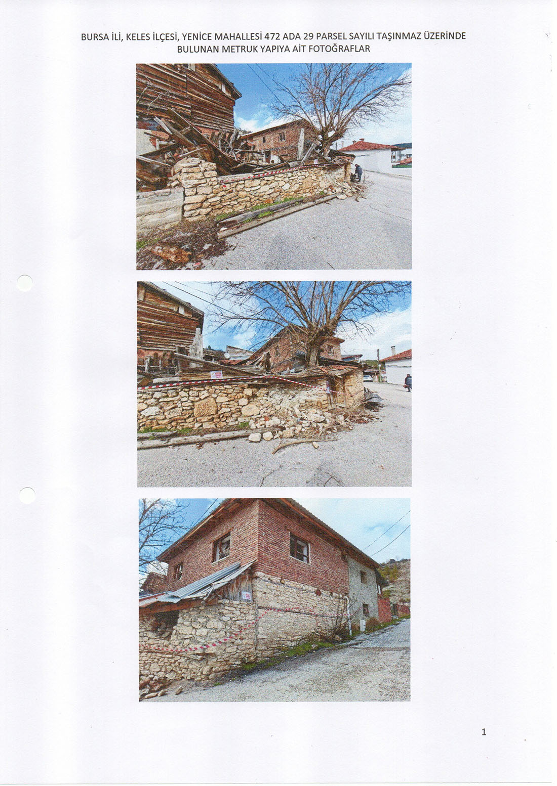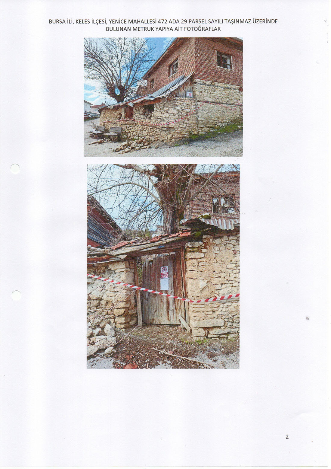 Belediyemiz teknik elemanlarınca yerinde yapılan incelemelerde; İlçemiz Yenice Mahallesi 472 ada 29 parsel sayılı taşınmaz üzerinde bulunan iki katlı yığma sisteme sahip binanın, taşıyıcı sisteminin tamamen sağlamlığını yitirdiği, doğramaların harap olduğu, tek katlı yapının yığma taşıyıcı sistemli, çatısında göçükler meydana geldiği, bahçe duvarının ise yığma taşıyıcı sistemli olduğu ve göçmekte olduğu görüldü. Söz konusu yapıların metruk halde bulunduğu, genel güvenlik ve asayiş bakımından tehlike arz ettiği, ayrıca mahalle halkı için can ve mal kayıplarına neden olabileceği görülmüş ve tespit edilmiştir.