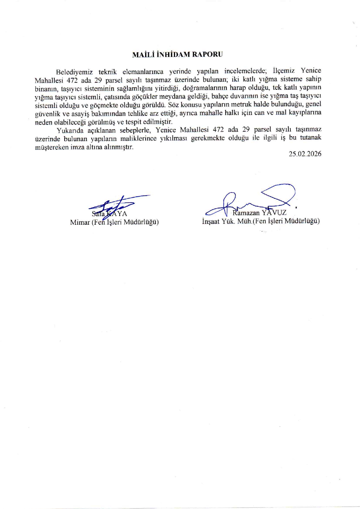 Belediyemiz teknik elemanlarınca yerinde yapılan incelemelerde; İlçemiz Yenice Mahallesi 472 ada 29 parsel sayılı taşınmaz üzerinde bulunan iki katlı yığma sisteme sahip binanın, taşıyıcı sisteminin tamamen sağlamlığını yitirdiği, doğramaların harap olduğu, tek katlı yapının yığma taşıyıcı sistemli, çatısında göçükler meydana geldiği, bahçe duvarının ise yığma taşıyıcı sistemli olduğu ve göçmekte olduğu görüldü. Söz konusu yapıların metruk halde bulunduğu, genel güvenlik ve asayiş bakımından tehlike arz ettiği, ayrıca mahalle halkı için can ve mal kayıplarına neden olabileceği görülmüş ve tespit edilmiştir.